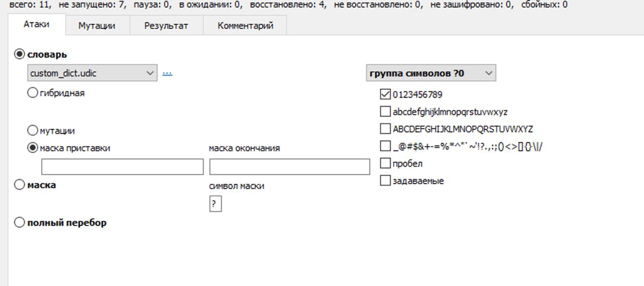 Следующий шаг — на основе словаря с токенами (зададим файлу имя custom_dict.udic) создать атаку с использованием шаблонов или масок. Проще всего задать маски окончания и/или приставки. В этом случае к каждому слову из целевого словаря будет добавляться окончание и/или приставка, сформированная согласно правилам. Например, в Elcomsoft Distributed Password Recovery правило «?d(0-99)» добавит число от 0 до 99 включительно; полный список правил описан в документации продукта.